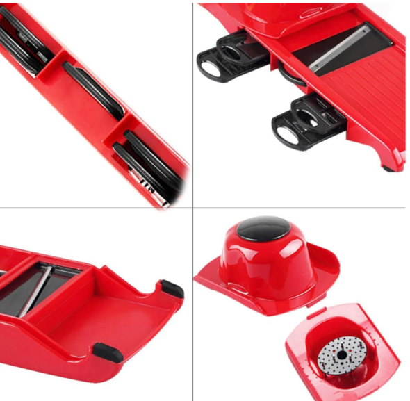 Cortador manual de verduras - Hoja de acero de alta calidad- Eficiente- Práctico- Fácil de lavar- Varias opciones de uso- Hoja de alta calidad- Recipiente para guardar y almacenar verduras mientras las cortas- El pelador tiene clavos de acero en la parte inferior para sujetar mejor las verduras y proteja sus manos. El paquete incluye: 2 cuchillas de corte - 1,2 mm, 2,2 mm 2 cuchillas estilo juliana - 2,5 mm, 3,5 mm 1 cuchilla a la parrilla 1 rallador 1 pelador 1 recipiente 1 cortador con mano protector 1 Safe Storage Rack